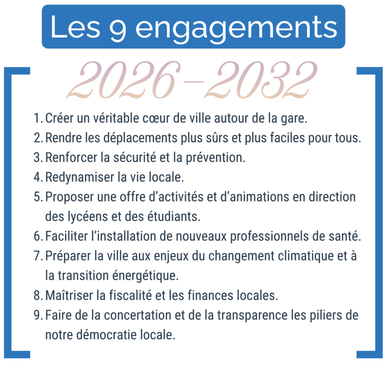 Notre programme fixe un cap ambitieux pour 2026-2032, articulé autour de neuf engagements structurants. Il sera mis en œuvre avec vous, dans un esprit d’ouverture, de transparence et de responsabilité.